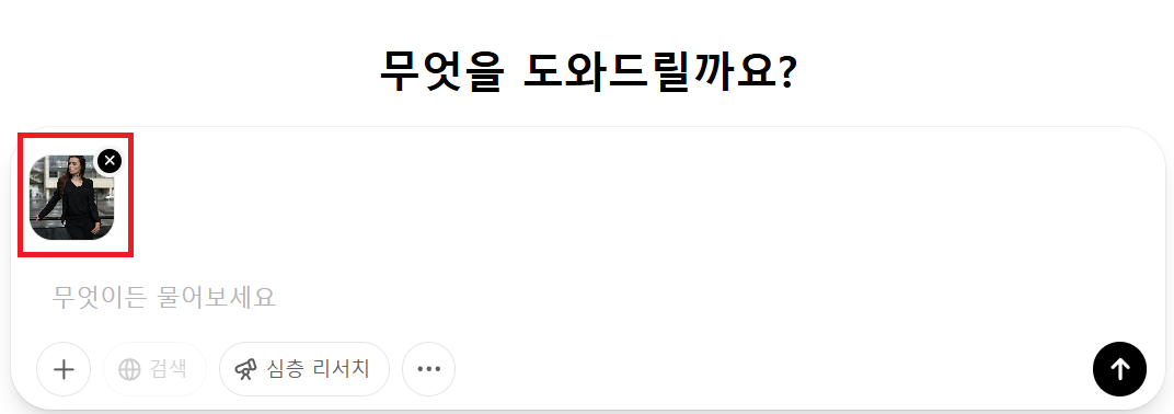 ChatGPT 채팅창에서 클립 아이콘을 클릭하거나 이미지 파일을 드래그 앤 드롭하여 업로드합니다. 업로드가 완료되면 이미지가 채팅창에 나타납니다.